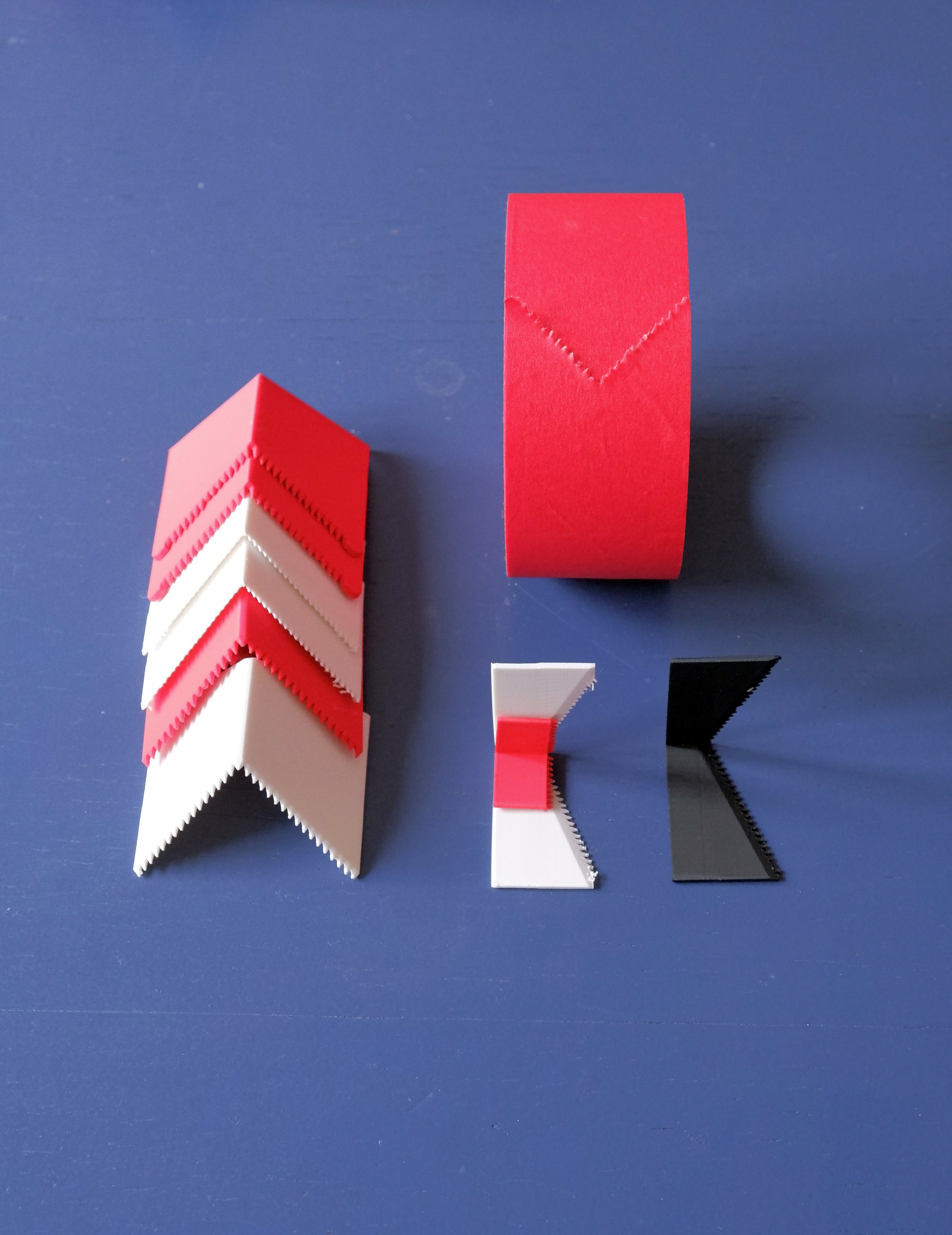 Mi piace molto la scelta di aver reso protagonista lo scotch più che l’oggetto in sé, e poi alcuni dettagli come il fatto che dopo il taglio i bordi delle frecce hanno una zigrinatura visibile, che gli da un'estetica un po' grezza e al tempo stesso aiutano a staccare le frecce con facilità.