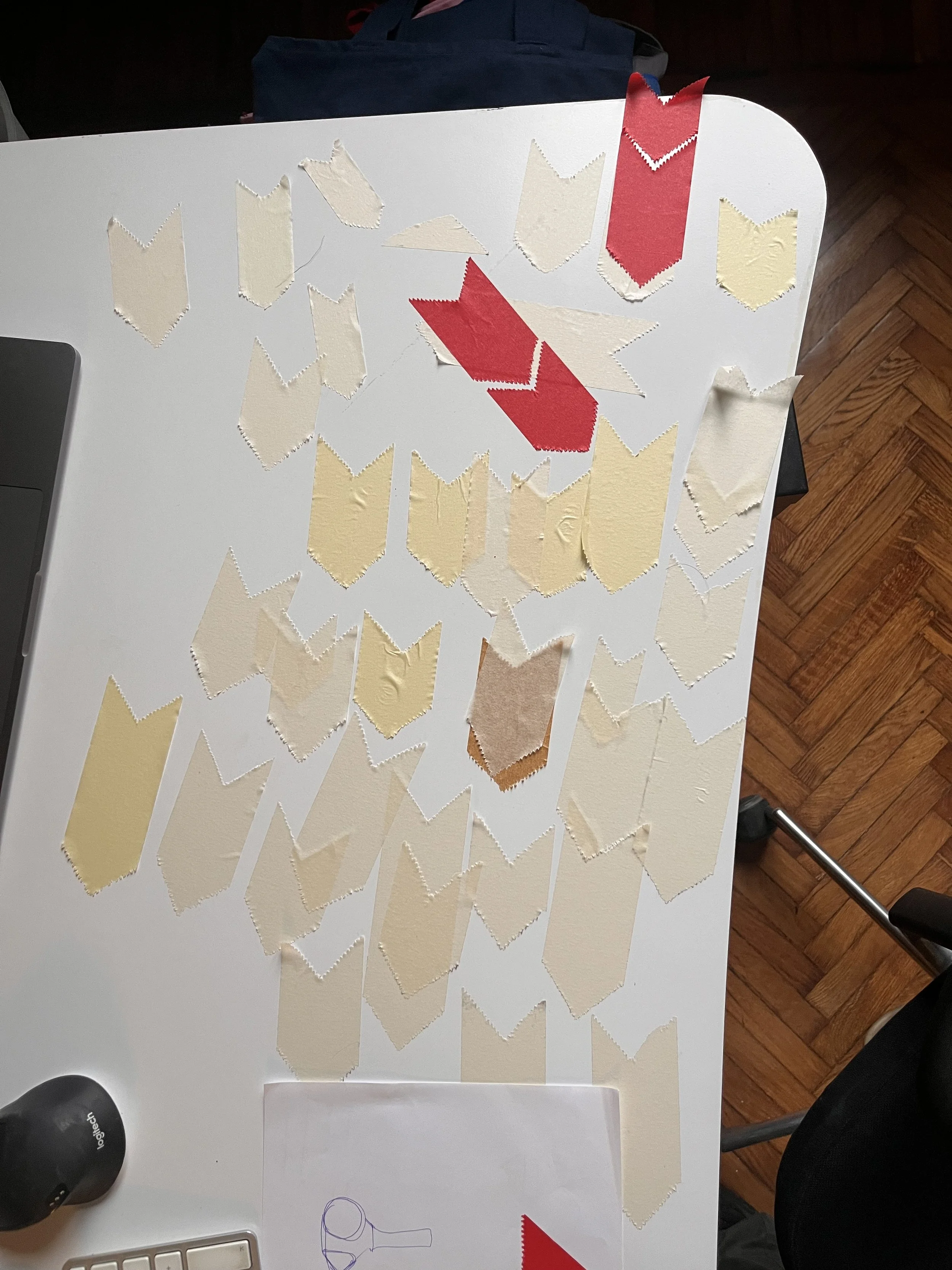 Per prima cosa ho preso dello scotch di vari formati e tagliato in diversi modi, con le mani, con altri oggetti, ho riempito la scrivania di frammenti.